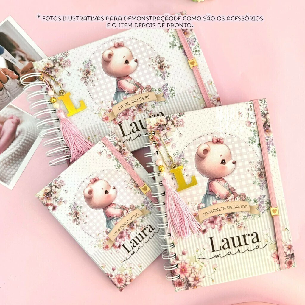 • Capa dura, personalizada com tema escolhido e nome da criança.